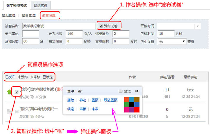 试卷的发布需要做两步操作: 1.试卷作者在试卷中设置该卷为发布状态 2.管理员在试卷列表的浏览页面进行审核