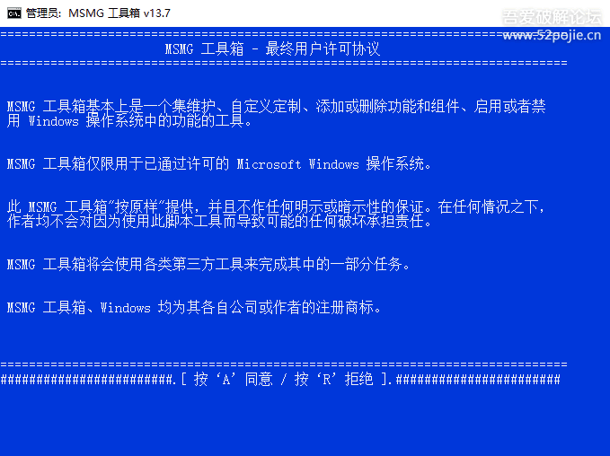 | MSMG Toolkit,是一款专为Windows系统设计的精简工具,致力于集成或移除系统映像中的特定功能、组件或内置应用。 兼容Win7到Win11多个版本,打造专属高效系统。 通过MSMG Toolkit,用户可以轻松移除Windows Apps组件、多媒体组件、本地系统语言文件等,甚至包括硬件支持、 系统组件等。它特别支持永久移除Edge浏览器、Cortana微软小娜等不必要的应用,以及移除Windows Defender组件等高级功能。 为了自己方便,做了汉化,由于是.cmd文件,界面和命令都在一起,难免有疏漏,敬请谅解! ![]() ![]() 官网:https://msmgtoolkit.in/ 蓝奏:https://wwjs.lanzoub.com/b00vnde9g 密码:52pj |