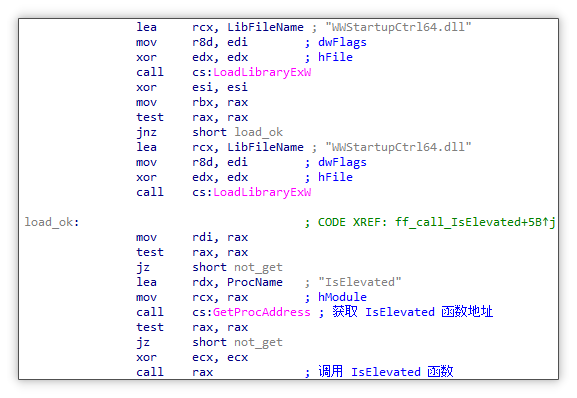 调用恶意模块入口点:该样本的服务主程序为 alcloud.exe ,该程序会调用 WWStartupCtrl64.dll 动态库中的 IsElevated 导出函数。此导出函数为恶意模块入口点。