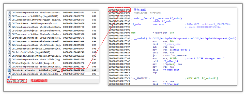 混淆函数名:该恶意模块存在名字各异的 1479 个导出函数,其中所有的名称与函数逻辑几乎都不一致。其目的在于混淆干扰逆向人员的分析。