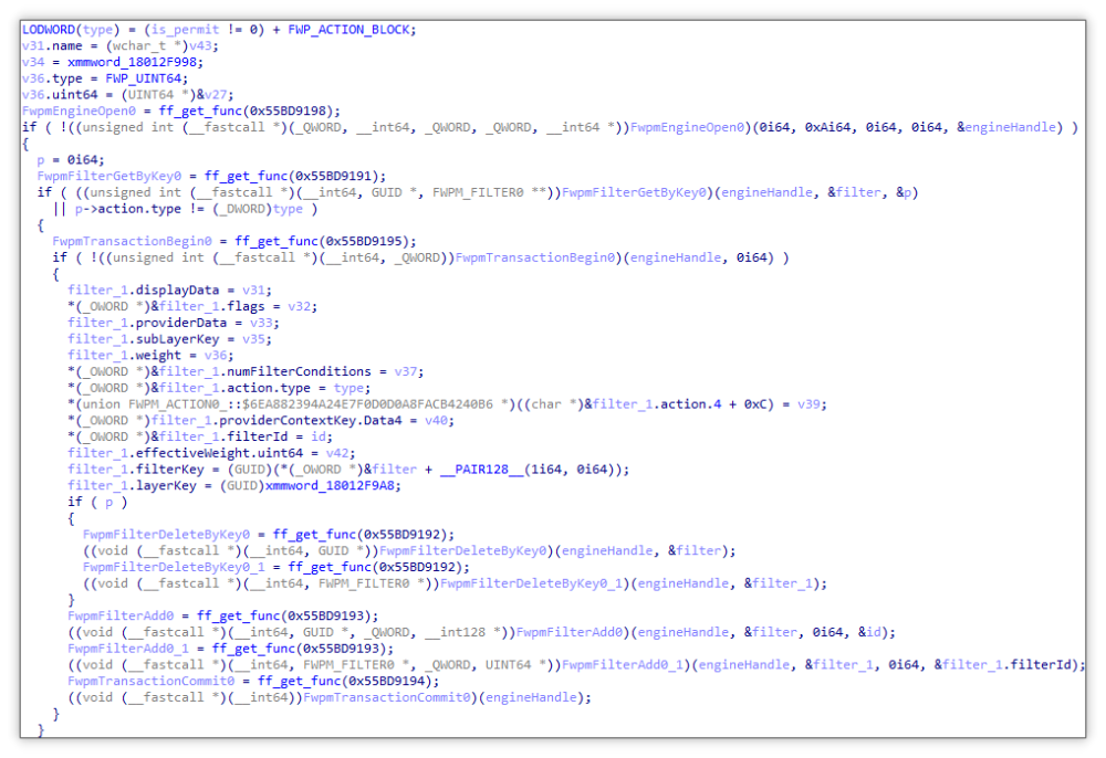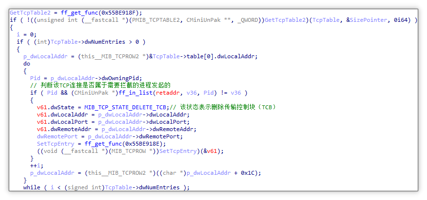 破坏并禁止安全软件的网络通信:样本先利用 SetTcpEntry 函数将状态设置为 MIB_TCP_STATE_DELETE_TCB(删除传输控制块)。随后,利用 FwpmFilterAdd0 函数添加限制网络通信的防火墙规则 FWP_ACTION_BLOCK,从而限制安全软件(如 360、火绒、金山等)的网络通信。