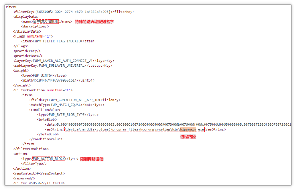 通过 netsh wfp show filters 命令导出防火墙规则。导出的规则列表如下,其中“简单防火墙规则”为样本所添加的防火墙规则,该规则将会限制指定进程的网络通信。