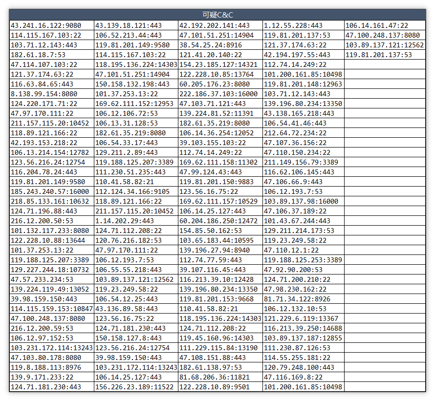远程服务器列表中的所有 IP 与端口如下。根据逆向分析连接服务器后代码逻辑推测,表中的 IP 为已被病毒作者所控制的服务器。测试发现,大部分 IP 无法连接,可能是病毒作者在一段时间内只开放其中某个远程服务器,从而避免控制的服务器一次性全部暴露。