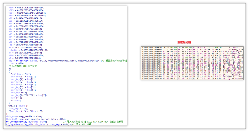 其中, RSA 秘钥通过样本初期的异或解密获取。AES 秘钥从 RSA 秘钥的偏移 0x64 处截取的长度为 10 字节的数据。