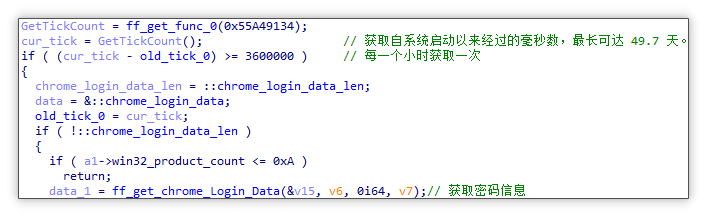 窃取 Chrome 登录数据:样本会每一个小时获取一次 Chrome 登录数据,还会根据获取到的系统信息(系统中 MSI 安装程序数量)判断是否要窃取。