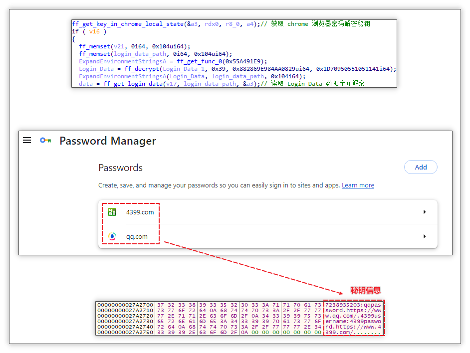 接着,读取路径为 Google\Chrome\User Data\Default\Login Data 数据库,该数据库为 SQLite 数据库。通过 SELECT origin_url, username_value, password_value FROM logins ORDER BY date_created DESC 指令获取域名、用户名、密码(密码利用 Local State 中的秘钥 key 进行解密)等信息。