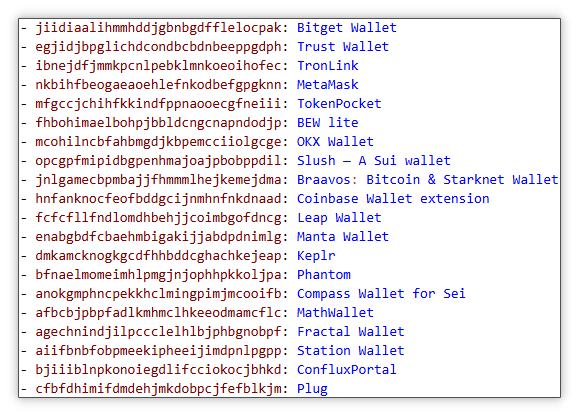 检查 Chrome 钱包类插件:样本通过检测 SOFTWARE\Google\Chrome\PreferenceMACs\Default\extensions.settings 路径中是否存在特定插件 ID,从而判断是否存在用于加密货币交易的Chrome钱包类插件。用于加密货币交易的插件及 ID 如下。