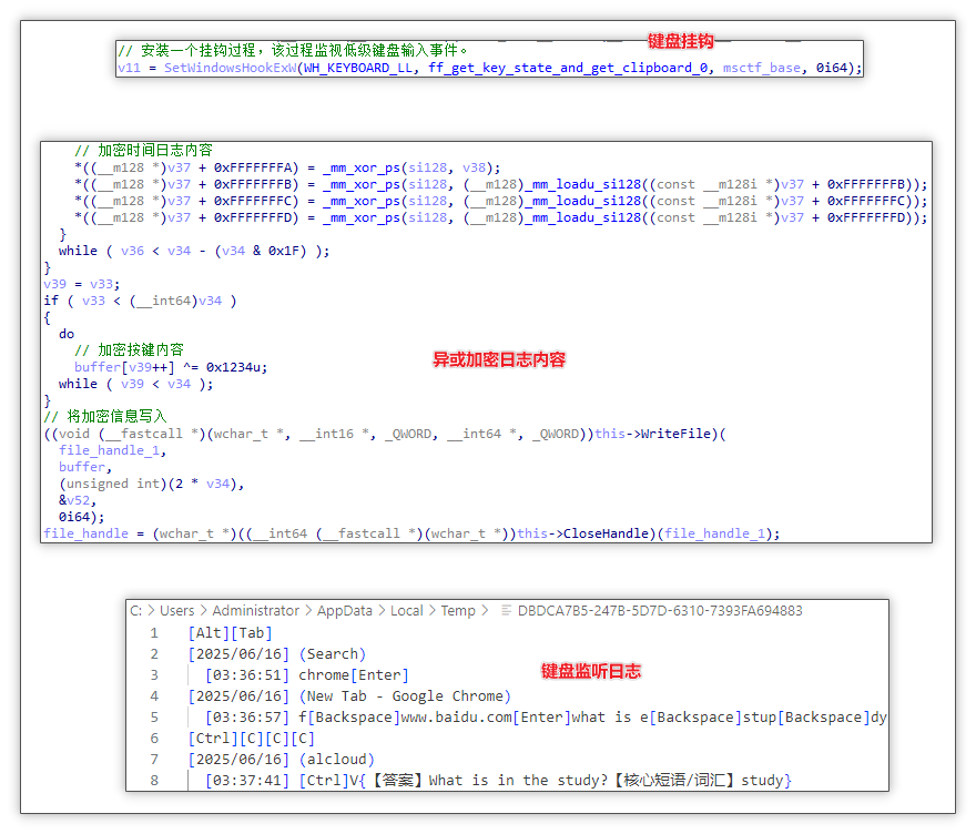 窃取剪切板和监控键盘:样本通过调用 SetWindowsHookExW 函数并传入 WH_KEYBOARD_LL,实现对键盘输入事件的监听。随后,记录按键信息和用户粘贴的文本内容。之后,将记录的数据异或加密并储存到 Temp 目录下的 DBDCA7B5-247B-5D7D-6310-7393FA694883文件中。该文件名通过调用 HashData 函数对硬编码数据进行计算获取。日志解密后的内容如下。