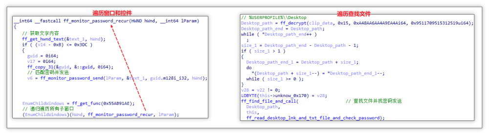 窃取密码或私钥:样本通过检测剪切板更新、遍历窗口和控件提取文本、遍历桌面查找名为 *.lnk 和 *.txt 的文件,并匹配特殊字符串或正则表达式,判断是否为密码或加密货币私钥,从而将匹配到的内容发送到远程服务器。