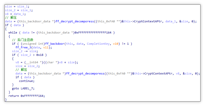 后门指令接收:样本接收到来自远程服务器的数据后,先对数据进行解压,随后将解压后的数据传入后门主函数。之后,根据控制码执行对应的后门功能。