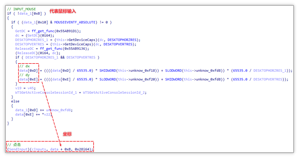 除上述后门功能外,该样本还具备截屏、模拟鼠标点击、服务相关功能。其中,截屏功能通过对比前后两帧的异或结果来获取屏幕变化差异并上传,以此降低数据传输开销。