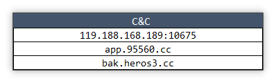 远程服务器地址来源:首先,样本设置远程服务器列表,其结构为 IP 和端口的组合形式。随后,样本会遍历该表,并逐一进行连接尝试。动态调试时发现,119.188.168.189:10675 为恶意远程服务器。最后,样本还会尝试连接 app.95560.cc 和 bak.heros3.cc。