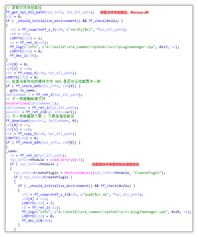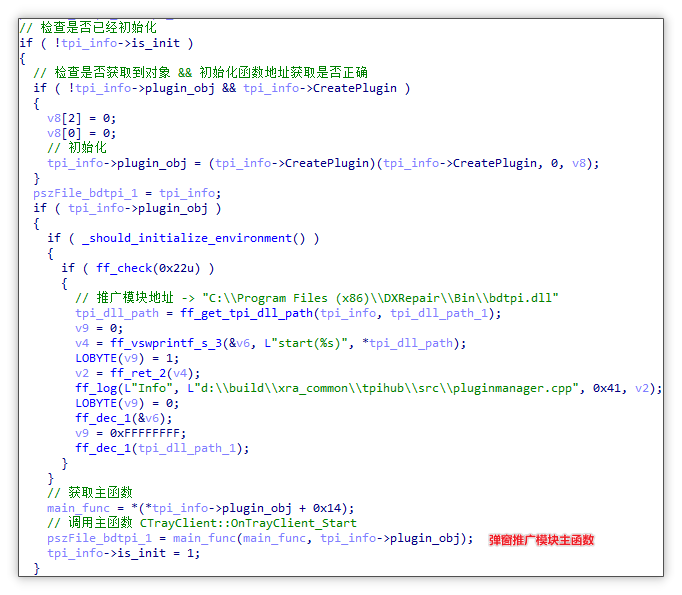 下载并加载获取其中初始化函数地址:随后先获取文件存放路径,随后检查该路径文件的 MD5 值是否与云控配置中的 MD5 值一致,如果不一致则会删掉原文件并通过 tpi_url 下载新的弹窗推广模块并加载该模块,获取其中 CreatePlugin 初始化函数地址。