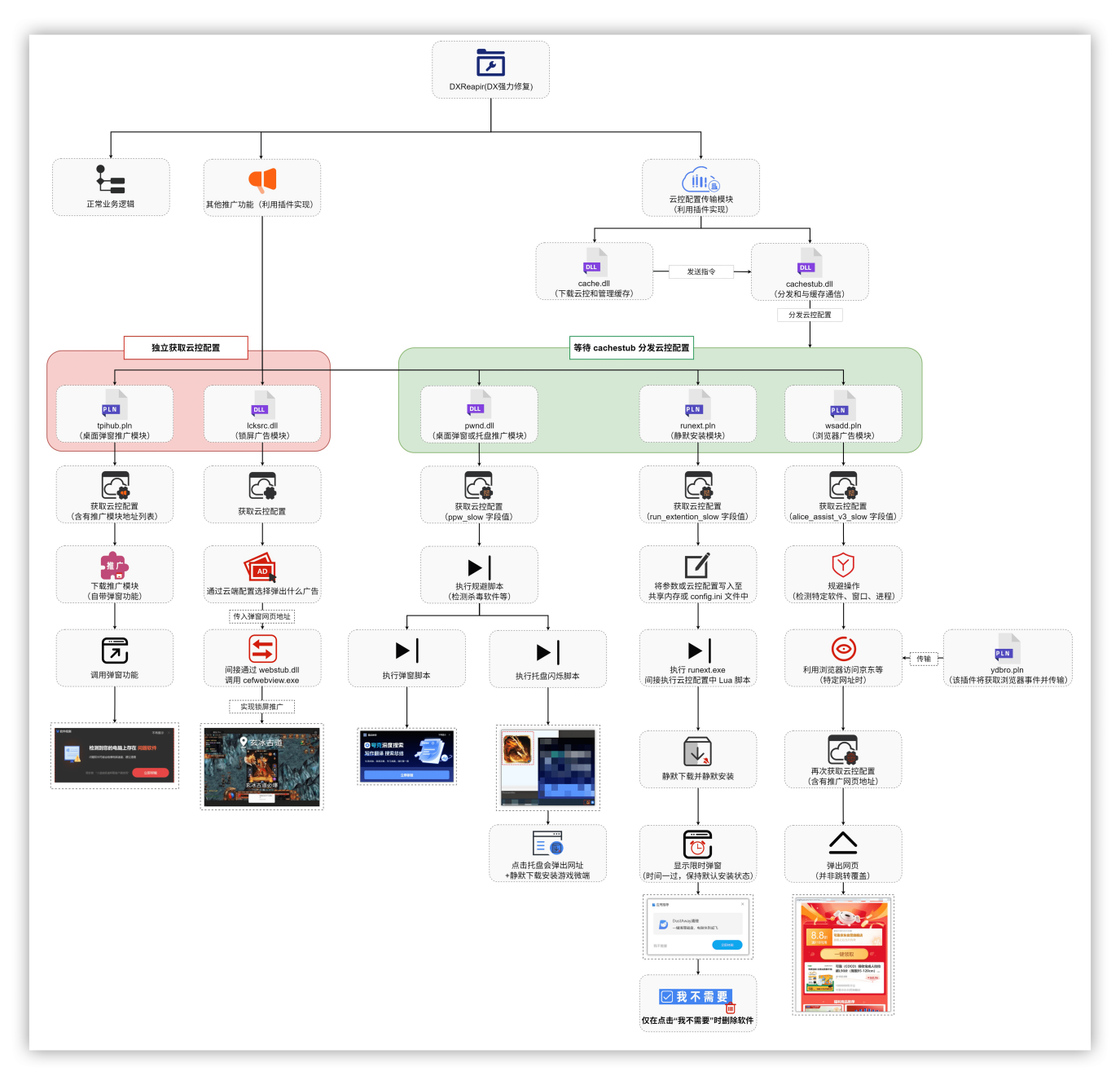 多个推广插件:插件是以独立文件的形式存储在安装目录下的 Bin 或 Plugins 文件夹下,其中推广相关插件分别有弹窗推广、锁屏推广、任务栏托盘推广、静默下载安装推广、浏览器广告等模块。其他插件例如 cache.dll 和 cachestub.dll 主要是用于云控配置的下载和分发至插件。
