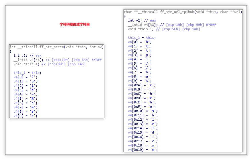 拼接字符串:其中部分字符串通过单字符拼接的方式获取,从而规避静态字符串提取,加大逆向分析复杂度。