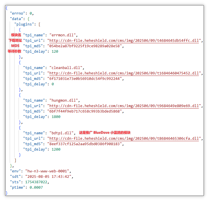 解析弹窗推广云控配置:获取到的云控配置中含有多个推广模块,本文以 bdtpi.dll(小蓝鸽弹窗推广模块)为示例进行分析,可以看到其中含有模块本地名、模块下载地址、模块哈希值、模块等待秒数,随后该模块对云控配置进行解析并准备下载。