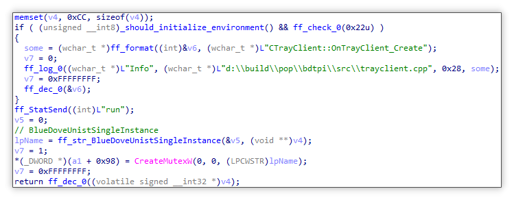 创建互斥体:该模块也与分发模块类似,初始化时创建互斥体 BlueDoveUnistSingleInstance,只是名称不同,且后续也会等待互斥体,防止出现冲突。
