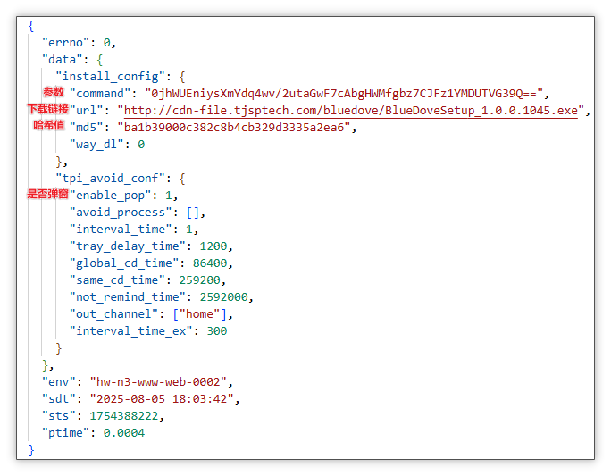 获取云控配置:随后开始获取云控配置,请求链接 http://base.heheshield.com/k/bluedove/install 并传入参数 pid(下载平台,例如 lx_store 联想商店)。可以看到其中包含下载链接、执行参数、安装包哈希值、控制弹窗等数据。其中 command 为经过密钥 blowfish 加密(密钥LAG9R1ZFWIS3J2LDHBAWZ50OGSAB99US)与 base64 编码后形成的数据,解密发现是 /S --pid=lite_n3 --optimize --run,其中测试得知 /S 参数为无弹窗静默安装参数。 云控配置