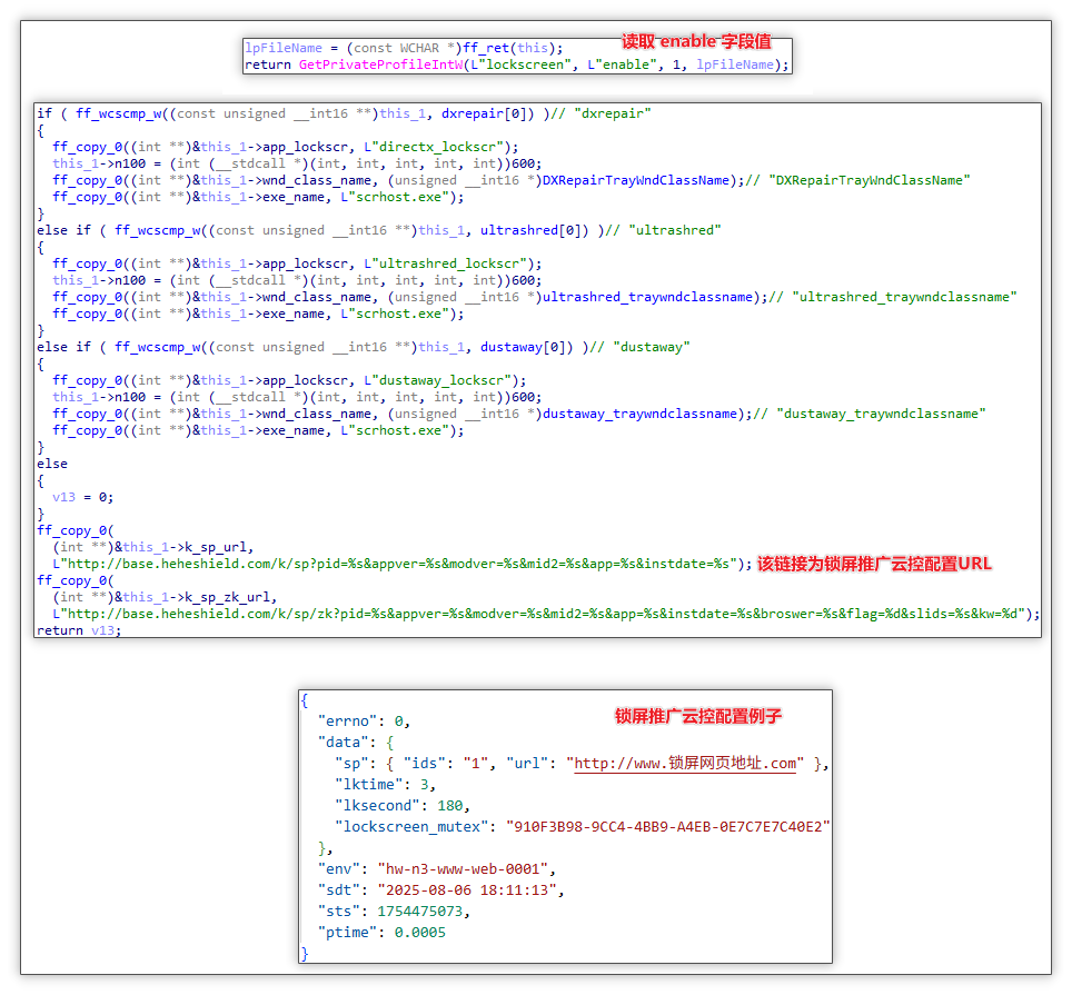 初始化:初期会先将软件相关 URL、类名、软件名等信息存储至全局变量中,随后通过读取 AppData\Roaming\cdheheyoudun\config.ini 中读取 lockscreen 项下 enable 字段,如果为 1,则会继续执行。随后会请求至 base.heheshield.com/k/sp 获取锁屏相关云控配置。