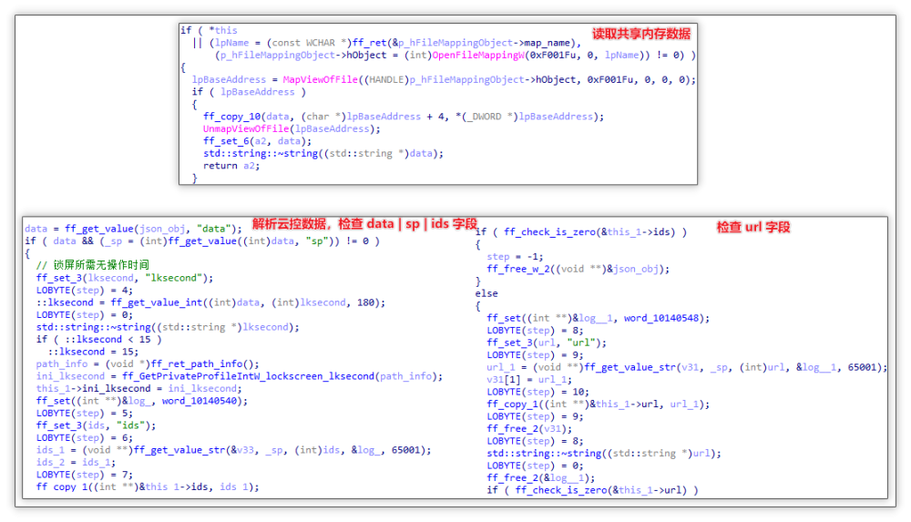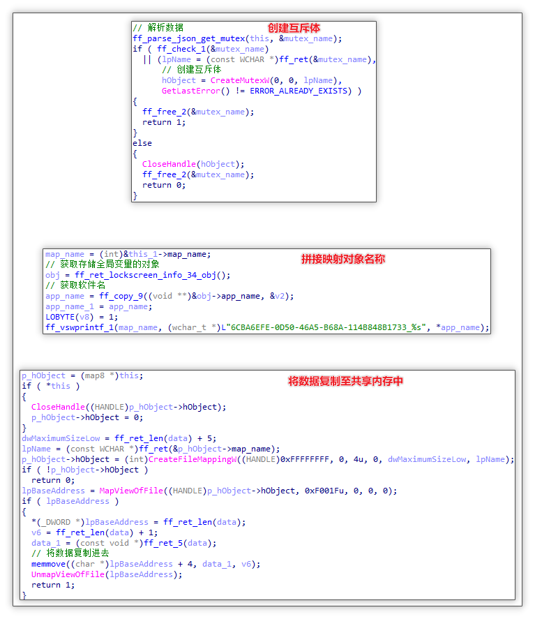 创建互斥体与云控配置写入共享内存:随后解析云控配置并从中提取 lockscreen_mutex 字段值作为名称创建互斥体,随后利用全局变量获取软件名,并与 6CBA6EFE-0D50-46A5-B68A-114B848B1733_ 拼接为指定文件映射对象的名称并创建内存映射将云控数据写入到其中。