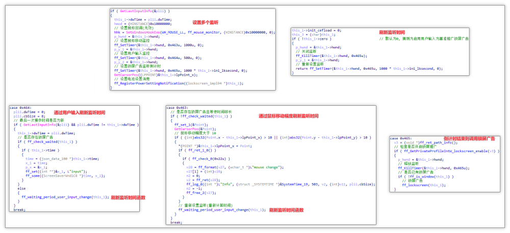 倒计时监听器设置:设置三个 Timer 监听器,其中 0x463 与 0x464 事件可以利用用户输入与鼠标移动幅度刷新监听时间,0x465 事件可以在倒计时结束后调用锁屏广告。