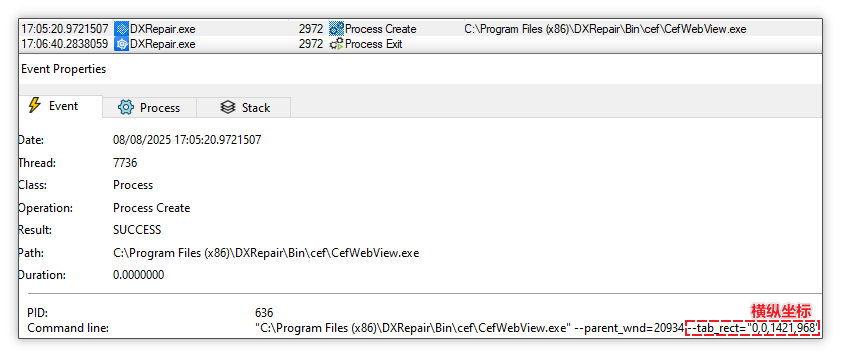 展示锁屏广告:随后通过 webstub.dll 间接创建 cefwebview.exe 程序,并传入参数 url(网页地址)与 tab_rect(横纵坐标)设置为全屏大小,从而实现全屏展示锁屏广告,其中进程 cefwebview.exe 是 Chromium Embedded Framework (CEF) 的内核,可在独立窗口中渲染指定 URL 网页内容。