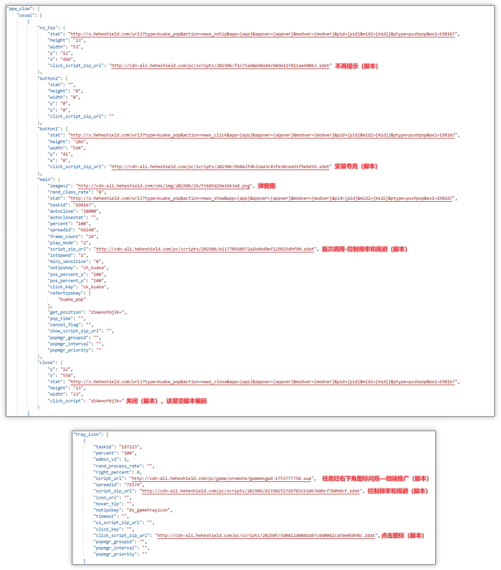 大致流程:获取 cachestub.dll 分发的云控配置中 ppw_slow 字段值,其中 usual 字段值用于弹窗推广,tray_icon 用于托盘推广(主要为传奇微端推广),随后pwnd.dll会下载并执行两个字段值中不同的脚本,例如控制频率和规避脚本以及安装脚本,从而实现弹窗与托盘闪烁,其中点击托盘会打开网页,并根据云控配置判断是否下载传奇微端并执行。