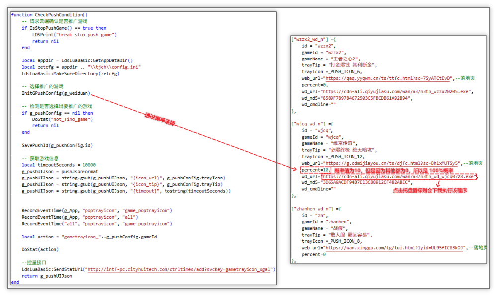 选择需推广的游戏,创建托盘并闪烁:随后通过概率选择推广的游戏,下图代码示例为 100%概率推广“wjcq”游戏,这是因为该表中的其他游戏 percent 值都为 0,所以 10 概率则为 100%推广,随后创建托盘并闪烁。