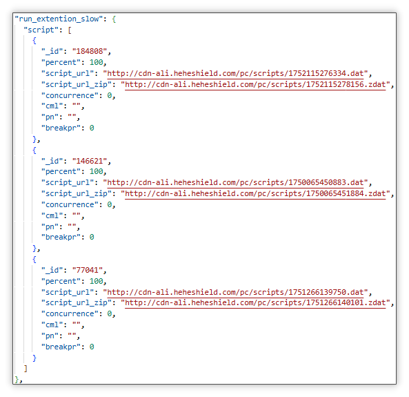 云控配置来源:与 pwnd.dll 模块一样,也是通过 cache.dll 获取云控配置并通过cachestub.dll 传输,不同的是 pwnd.dll 会利用 ppw_slow 字段值,runext.pln 会利用 run_extention_slow 字段值执行脚本,下图中 script_url 与 script_url_zip 分别为非压缩和压缩包形式的被加密 Lua 脚本。