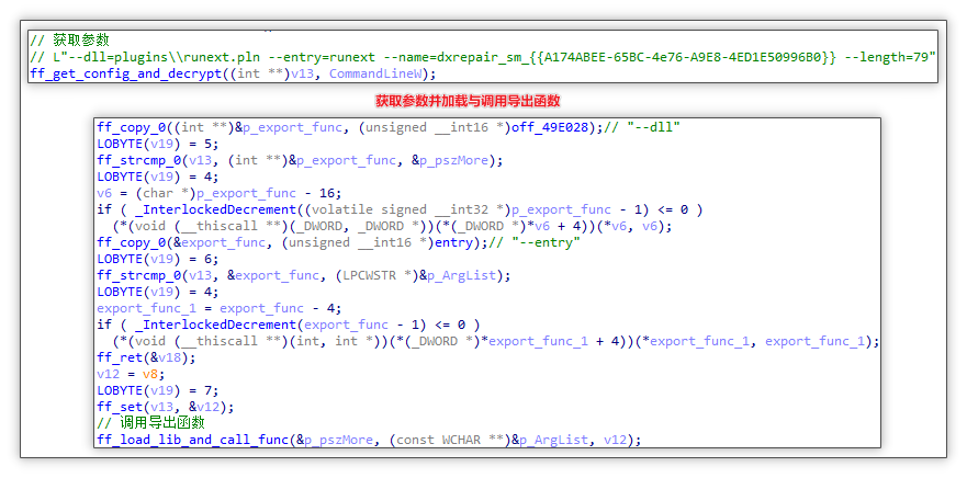 runext.exe 进程通过ini 文件与共享内存,加载和调用执行脚本的函数:在 runext.exe 进程中,将会通过解密上述 config.ini 文件中 cdl 字段值获取到共享内存名称,随后读取共享内存中的 JSON 数据并获取 event 与 url 值。随后通过参数中的 --dll 与 --entry 获取到插件名称 runext.pln(即本模块) 与导出函数名称(runext,用于执行脚本的函数),分别加载和调用。