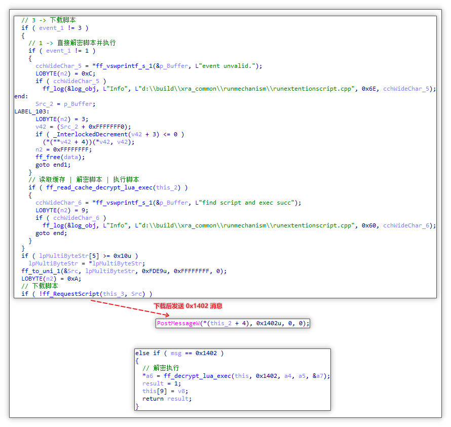 执行脚本前期准备以及创建 runext.exe 执行脚本进程:获取到 cachestub.dll 模块发送过来的数据后,通过 event 数值进行不同的操作,若 event 值为 1 或 3 时则会准备执行脚本,而值为 2 的时候将会执行删除缓存操作。如下图所示,其中 1 或 3 时会先解析传过来的 JSON 数据后构造出新的 JSON 数据(该数据中包含 event 值与 url 值),随后将 0x1401 消息传递出去,该消息的含义是该模块中为执行脚本。
