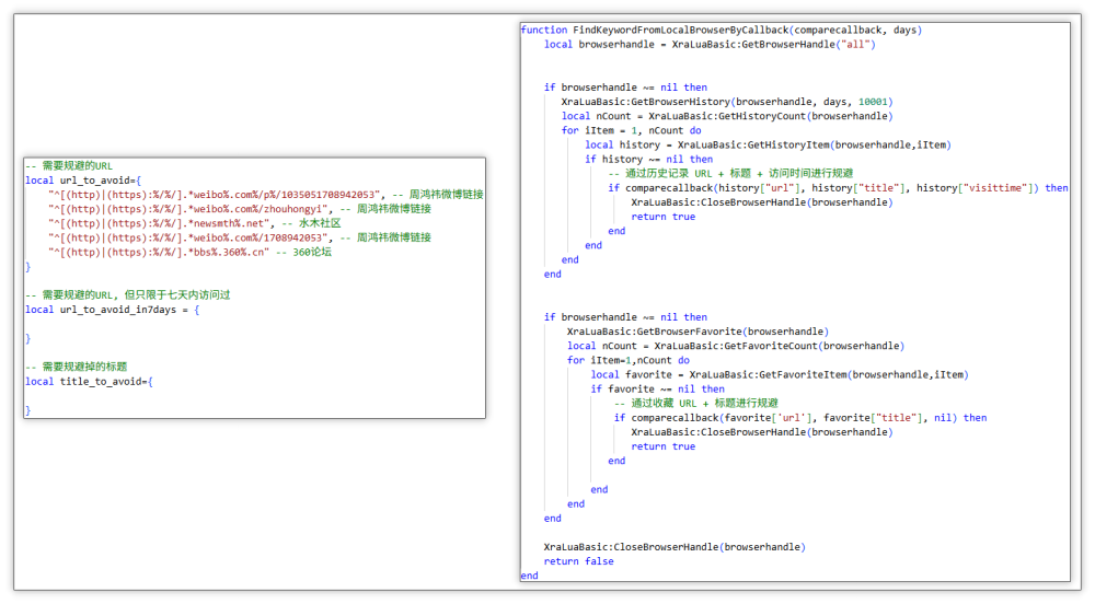 规避特定浏览器历史记录与收藏中 URL:其中某个 Lua 脚本还会获取浏览器历史记录与收藏的网址进行规避,猜测是不想干扰特定人群,从而避免麻烦。