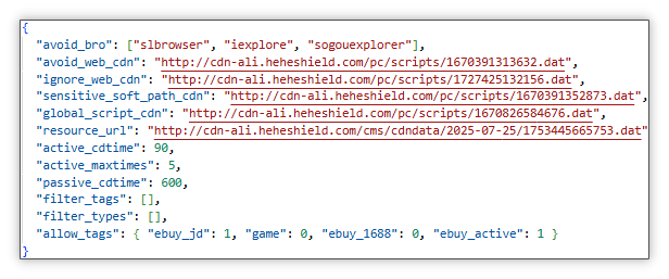云控配置来源和作用:与 pwnd.dll 模块一样,不同的是 wsadd.pln 会利用 alice_assist_v3_slow 字段值。其中 avoid_bro、avoid_web_cdn、sensitive_soft_path_cdn 分别规避特定浏览器、访问特定网址、特定软件;global_script_cdn 为动态开关(一般为 Lua 脚本 return "1");resource_url 为匹配特定网页并弹出推广网页所用。