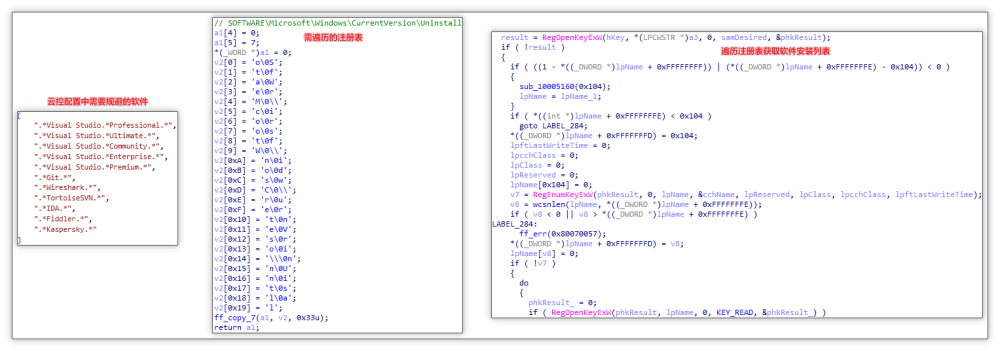 检测安装的软件(sensitive_soft_path_cdn):遍历注册表 HKEY_LOCAL_MACHINE\SOFTWARE\Microsoft\Windows\CurrentVersion\Uninstall 获取安装列表并获取其中 DisplayName,与需要规避的软件列表比较,若符合规避条件,则终止推广操作。