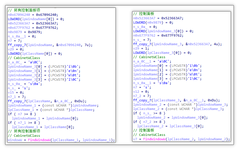检测控制面板窗口:检测标题名为“所有控制面板项”或“控制面板”以及类名为 CabinetWClass 的窗口,经过确认发现该类名为控制面板特有的类名。