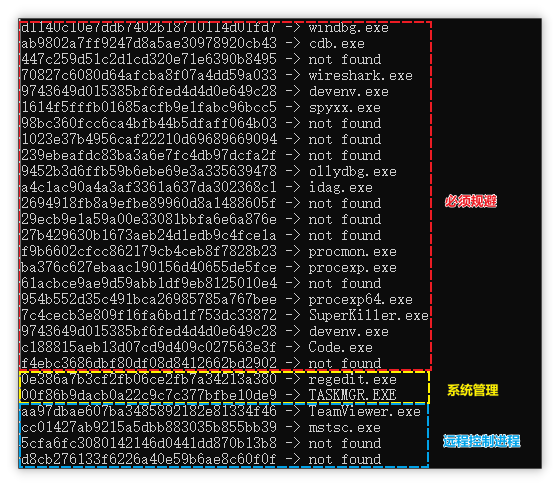 检测进程:将会进行检测的进程有三种,分别为必须规避、系统管理进程、远程控制进程,对应的处理方式也会不同。