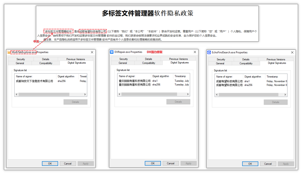 初期关注到该事件是因为火绒威胁情报系统中小蓝鸽数据异常,从而判断可能是有其他软件正在推广该软件,其中通过数据发现主要是来源于“多标签文件管理器”、“DX强力修复”、“Echofind”等多种软件,通过数字签名和隐私声明中发现这些软件是由“成都有望科技有限公司”和“重庆赫赫有盾科技有限公司”等制作。