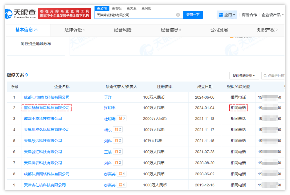 因为分析时发现 DX 强力修复软件会推广自家其他软件或其他公司的软件(例如 BlueDove 小蓝鸽签名为“天津简诚科技有限公司”),所以通过“天眼查”等查询软件发现这些公司之间有一些细微的联系,例如电话号码、姓名、邮箱后缀等地方出现意外关联。