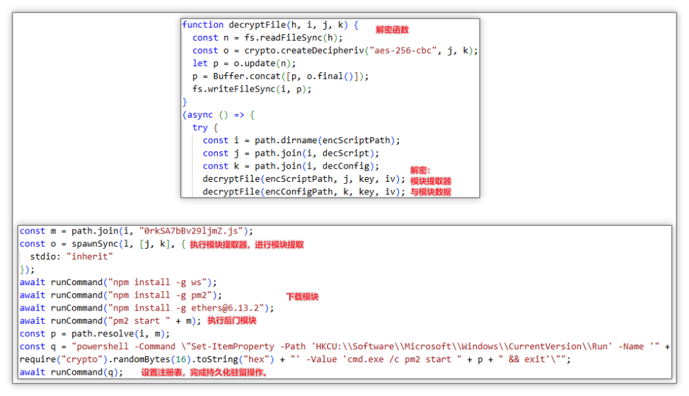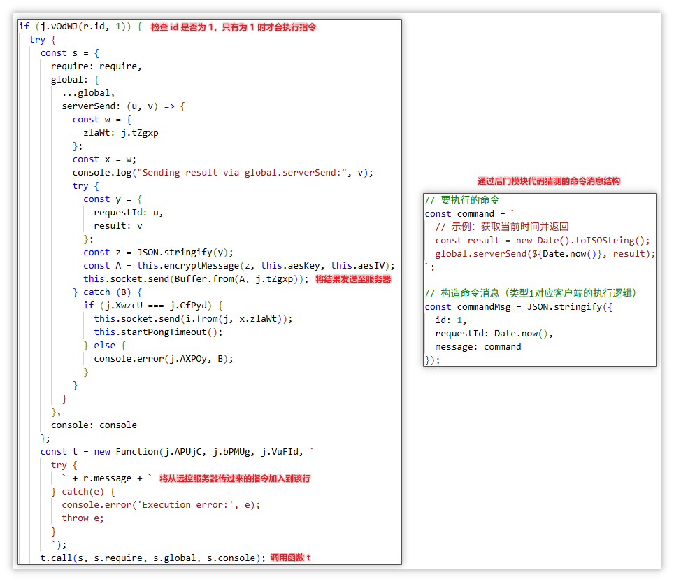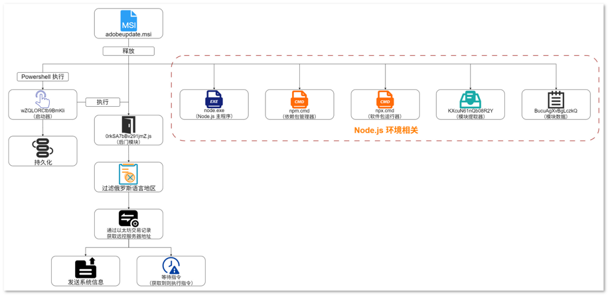 Node.js 作为一种高性能的 JavaScript 运行环境,凭借强大的功能广泛应用于服务器端开发,为开发者带来诸多便利。然而,其灵活性和跨平台特性在受到开发者青睐的同时,也逐渐吸引了攻击者注意。 近期,火绒工程师协助用户排查问题时发现一款利用 Node.js 语言开发的病毒。该病毒以 MSI 安装包形式传播,运行后会释放 Node.js 环境和经过混淆的后门代码文件。随后,病毒利用 PowerShell 修改注册表实现持久化,并通过以太坊交易记录获取远控服务器地址,最终实现执行任意指令。溯源时发现,其中一个远控服务器为该病毒的生成平台,授权用户可通过该平台生成病毒。火绒安全产品可对上述木马进行拦截查杀。 ![]() 查杀图 流程图如下: ![]() 流程图 一、样本分析 1.初始化 初始化时期目的:样本在初始化时期会准备 Node.js 环境并建立持久化机制,从而使后门模块能够在受害者系统中执行并实现持久驻留。 释放文件:样本以 MSI 安装包形式传播,其在执行初期释放的文件如下图所示。其中,启动器和后门模块共同组成恶意文件,其他文件均为 Node.js 代码执行所需的环境文件。 ![]() 释放出的文件 执行启动器:随后,样本利用 Powershell 执行被 Base64 编码的指令。解码后可知,该指令用于调用 node.exe 执行 wZQLORCtb9BmKli(启动器)。 ![]() Powershell 执行启动器 Node.js 代码被混淆:该启动器代码和后续的后门模块代码均为进行了混淆处理的 Node.js 代码。通过开源项目 js-deobfuscator 对其进行去混淆,可直接观察到病毒源代码。下图为部分混淆代码与部分去混淆后的代码。 ![]() 去混淆前后对比 安装 Node.js 环境,执行后门模块并持久化:该启动器利用 aes-256-cbc 算法解密 KXcuN61nQb08R2Y(模块提取器)与 BucuAgXvBgLczkQ(模块数据),并进行模块提取。 随后,通过 npm 包管理器安装 ws、pm2和ethers 等网络、进程、以太坊相关模块,从而保障后续后门模块执行所需的环境条件。 最后执行 0rkSA7bBv29ljmZ.js(后门模块),并通过调用 Powershell 将其写入注册表 Software\Microsoft\Windows\CurrentVersion\Run\{随机16字节}(开机自启注册表),从而完成持久化驻留操作。 ![]() 解密、执行后门模块、持久化 2.后门模块 最终目的:从远程服务器获取到指令并执行。 过滤俄罗斯语言地区:后门模块在获取服务器地址前会通过 PowerShell 获取当前系统用户界面语言,并将使用俄罗斯语言的设备过滤掉。从日志的语言为俄罗斯语推断,病毒作者可能有意避免影响俄语地区用户。 ![]() 过滤俄罗斯语言地区 获取远控服务器地址:随后,通过以太坊区块链中指定钱包(0x73625b6cdfecc81a4899d221c732e1f73e504a32)与指定智能合约(0xa1b40044ebc2794f207d45143bd82a1b86156c6b)的交易记录获取后门地址,例如 ws://104.219.234.251:3001。在该过程中,样本会先通过多个 RPC 节点获取后门地址,之后从中选取出现次数最多的地址作为当前后门地址。 ![]() 获取服务器地址 从 etherscan.io 中查询交易记录:通过以太坊区块链浏览器和数据分析平台 etherscan.io 查询到该代码中的钱包地址与智能合约的写入交易记录,从中可以看出该病毒作者会经常更新远控服务器地址。 ![]() 两天前再次换了一个远控服务器地址 获取动态 Key 与 IV:每次与服务器建立连接后,服务器都会下发新的 Key 与 IV 用于发送数据和接收服务器数据时的加密与解密。此加解密过程使用的算法仍是 aes-256-cbc。 ![]() 获取 Key 与 IV 代码与相应日志 发送系统信息:从远控服务器获取到动态 Key 和 IV 之后,开始发送用户名、电脑名、系统架构、处理器名、显卡名、MAC 地址、内存地址、卷序列号,以及 BIOS 信息等数据。 ![]() 获取信息代码与日志 等待服务器指令:随后,开始等待服务器下发指令。当接收到指令时,会先检查消息中的 id 是否为 1;若是,则将 message 插入到 try-catch 结构中。之后,对 message 进行调用,最后将结果加密后回传至远控服务器。但在分析过程中并未获取到服务器后续下发的指令内容。 ![]() 服务器指令接收执行并发送结果 3.溯源分析 在对该病毒进行溯源时发现,其中一个远控服务器(104.219.234.251)是该病毒的生成平台。此平台利用 Next.js 语言制作,具备多种 API,如 getBotsList(获取受害者用户列表)、sendCommand(发送指令)、sendBulkCommand(发送群体指令)等。推测认为,其中的 sendCommand 和 sendBulkCommand 很有可能是分析过程中未能获取到的服务器后续指令发送 API。 ![]() 发送指令 此外,该平台还具备编译功能,但此功能需要授权才能使用。通过该功能可以编译出 MSI 版与 PowerShell 版的病毒,猜测其中的 MSI 编译选项即可编译出此次分析的 MSI 安装包样本。 ![]() MSI 编译生成 二、附录 C&C: ![]() HASH: ![]() |